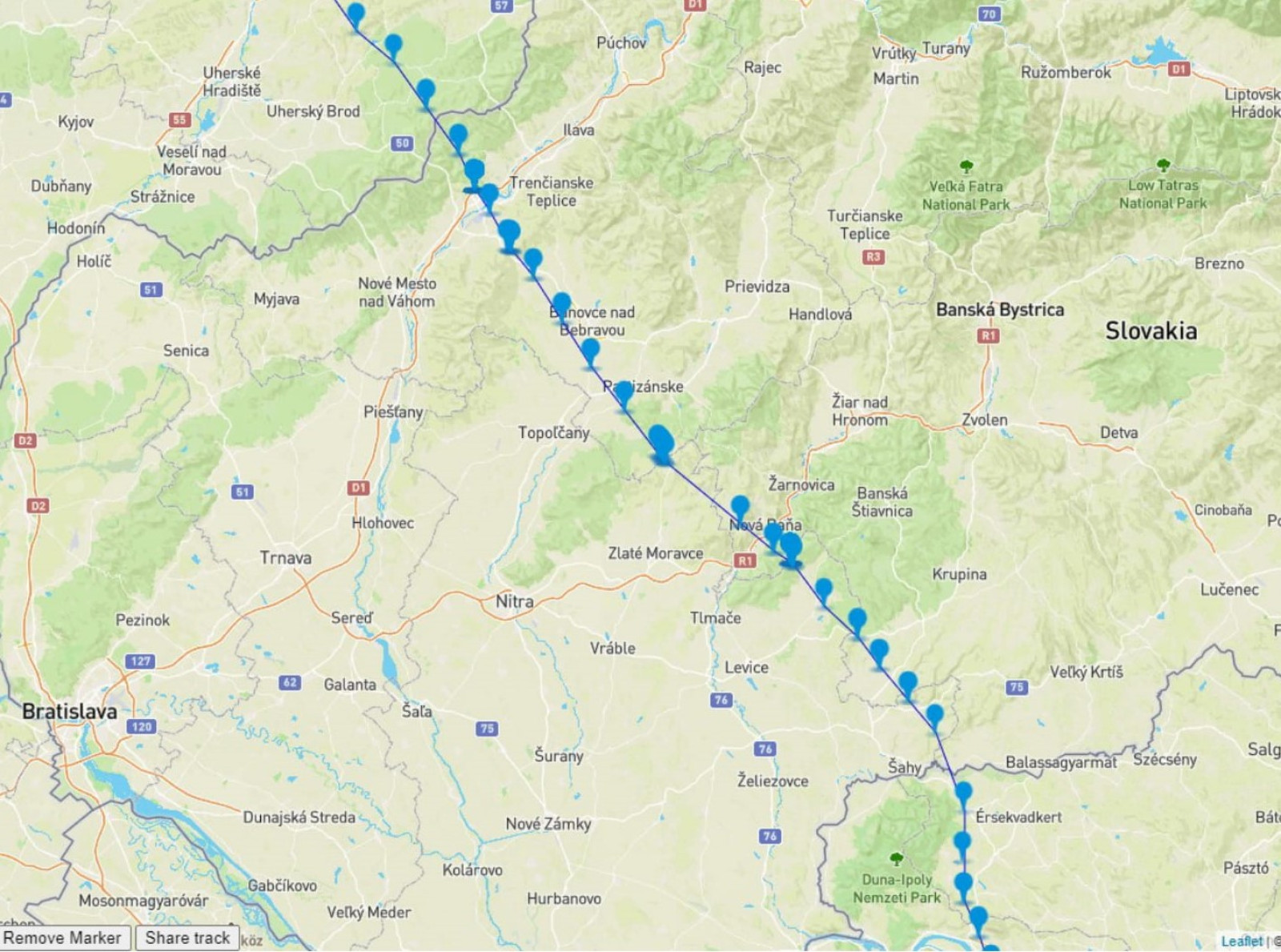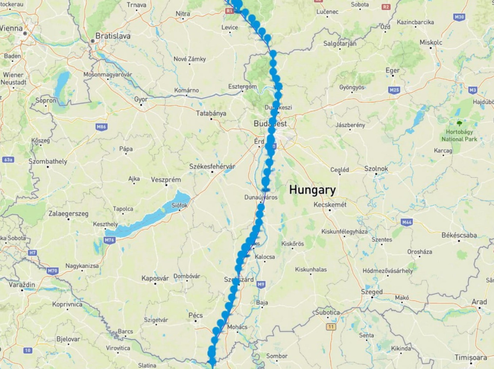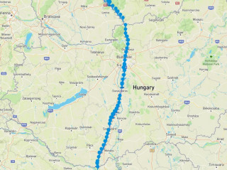 Zde je vidět záznam jeho maďarského putování. Stále kolem Dunaje až nad Budapešť a potom přelet hranice na Slovensko. |